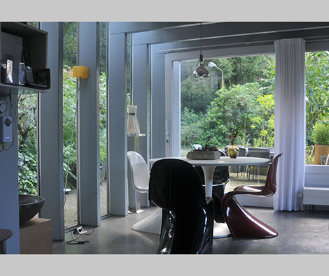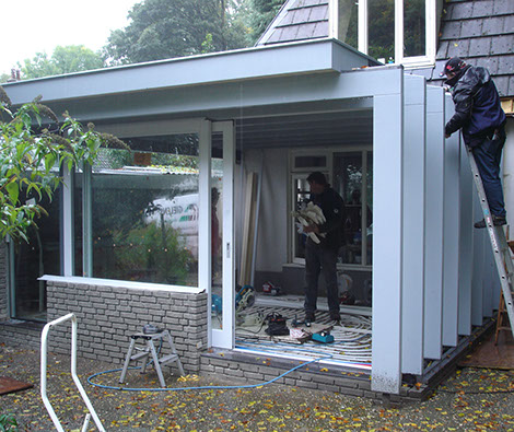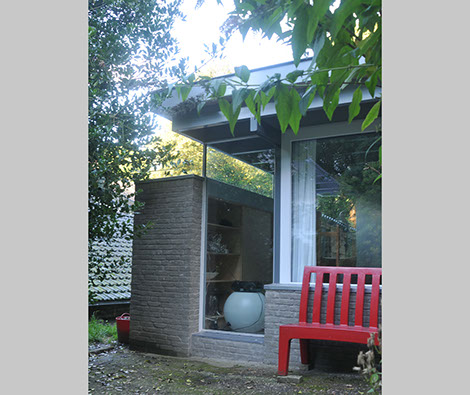 Het betreft hier een onderdeel van een rijksbeschermd ensemble; een voormalig koetshuis bij een monumentale villa in Beek-Ubbergen. Het koetshuis was in het verleden al verbouwd tot woonruimte. De vraag was om het beschikbare woonoppervlak uit te breiden met een tuinkamer. Uitbreidingsmogelijkheden waren enkel aanwezig aan de voorzijde van het pand. Het bestemmingsplan stond uitbreiding echter niet toe. Op basis van een eerste schets bleek de gemeente echter bereid tot een bestemmingsplanwijziging. Tot onze blijde verrassing bleek tegelijk ook monumentenzorg zich in de schets te kunnen vinden gezien de ambitie die eruit sprak. De commissie ging onder mandaat akkoord mits het plan goed en overtuigend zou worden gedetailleerd. Het ontwerp bestaat uit een losse gemetselde wand en een zwevende dakconstructie. De beglazing is kozijnloos uitgevoerd waardoor de verschillende elementen vrij van elkaar blijven.