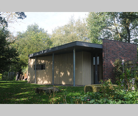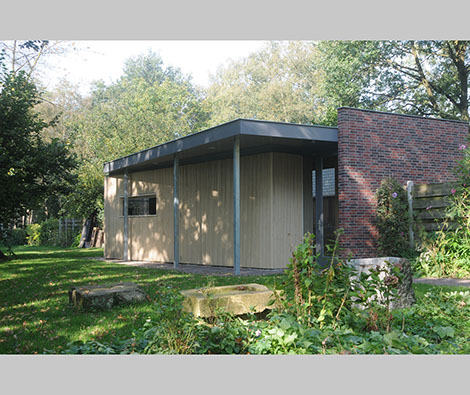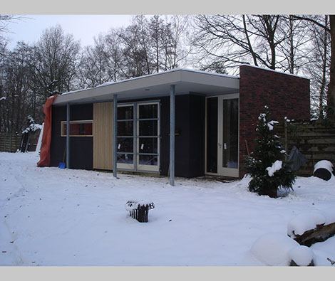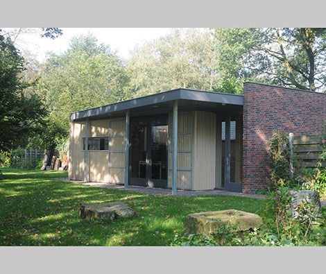 Het gebouw is een oefening in spelen met transparantie en met licht. Het gebouw bestaat uit drie onderdelen: een hoge rug van metselwerk, het dak in de vorm van een platte schijf waaronder een houten containerdoos is geschoven. De gevel van de doos is bekleed met houten latten van duurzaam Accoya-hout, deels in de vorm van gevelbekleding, deels in de vorm van grote luiken waarachter glasdeuren. De gevel is zodoende deels transparant, overdag aan de binnenzijde met het daglicht van buiten, ’s avonds en nachts aan de buitenzijde met het kunstlicht van binnen. Het gebouw is multifunctioneel en bevat een klein keukentje en een natte cel met het nodige sanitair. Nu in gebruik als atelier werkplaats, maar ook bruikbaar als gastenverblijf of kleine wooneenheid.