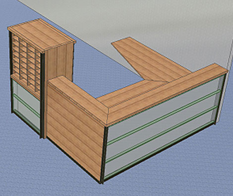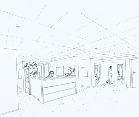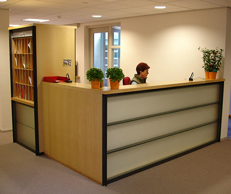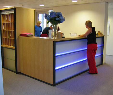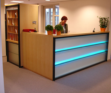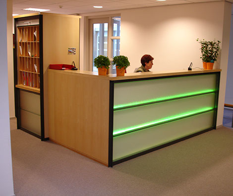 De balie staat in de entree van een dynamische organisatie voor hulpverlening die voortdurend aan verandering onderhevig is. Voor de balie is gebruik gemaakt van standaard glazen U-profielen (o.a. gebruikt in parkeergarages). De U profielen worden indirect verlicht door middel van led strips die geprogrammeerd geleidelijk van kleur kunnen veranderen. Het project stamt uit 2004 en was een van de eerste waarbij op deze manier gebruik gemaakt werd van led verlichting. De steeds veranderende kleur van de verlichting staat symbool voor het voortdurende veranderingsproces van de mensen binnen de organisatie. In de zelfde serie werden ook de kasten en bureautafels ontworpen.