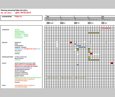Probleem was dat al deze werkzaamheden uitgevoerd moesten worden terwijl de paviljoens bewoond zouden blijven. De veiligheid mocht daarbij geen moment in gevaar komen. Ons buro werd verzocht om naast de gebruikelijke planvoorbereiding ook het hele uitvoeringsproces te organiseren en te bewaken. We hebben daartoe een planning gemaakt waarop dag voor dag voor ieder van de uitvoerende partijen precies stond aangegeven welke werkzaamheden die dag moesten worden uitgevoerd. Er werd met aangepaste werktijden gewerkt, in principe vanaf 9.00 uur ’s ochtends tot 15.00 uur ’s middags. Dit zijn de tijden dat de jongeren elders op school zitten. Het hele proces werd dagelijks van moment tot moment door ons buro gevolgd en bewaakt. Waar nodig werd meteen ingegrepen en tot actie overgegaan. Het luisterde allemaal ontzettend nauw; met name het aanbrengen van het nieuwe mechanisch ventilatiesysteem. Maar het lukte ! Het hele project was precies op tijd klaar. We merkten dat met name de traditionele onderaannemers (elektra, ventilatie, loodgieter, schilder e.a.) het plezierig vonden om ver vooraf te weten wat zij op een bepaald moment moesten komen doen.